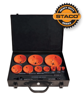 Набор коронок из быстрорежущей стали с биметаллическим наконечником из 8 % кобальта и сверла. Все упаковано в прочный металлический чемодан. Для материалов: дерево, сталь, алюминий, пластик, латунь.