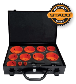 Набор коронок из быстрорежущей стали с биметаллическим наконечником из 8 % кобальта и сверла. Все упаковано в прочный металлический чемодан. Для материалов: дерево, сталь, алюминий, пластик, латунь.